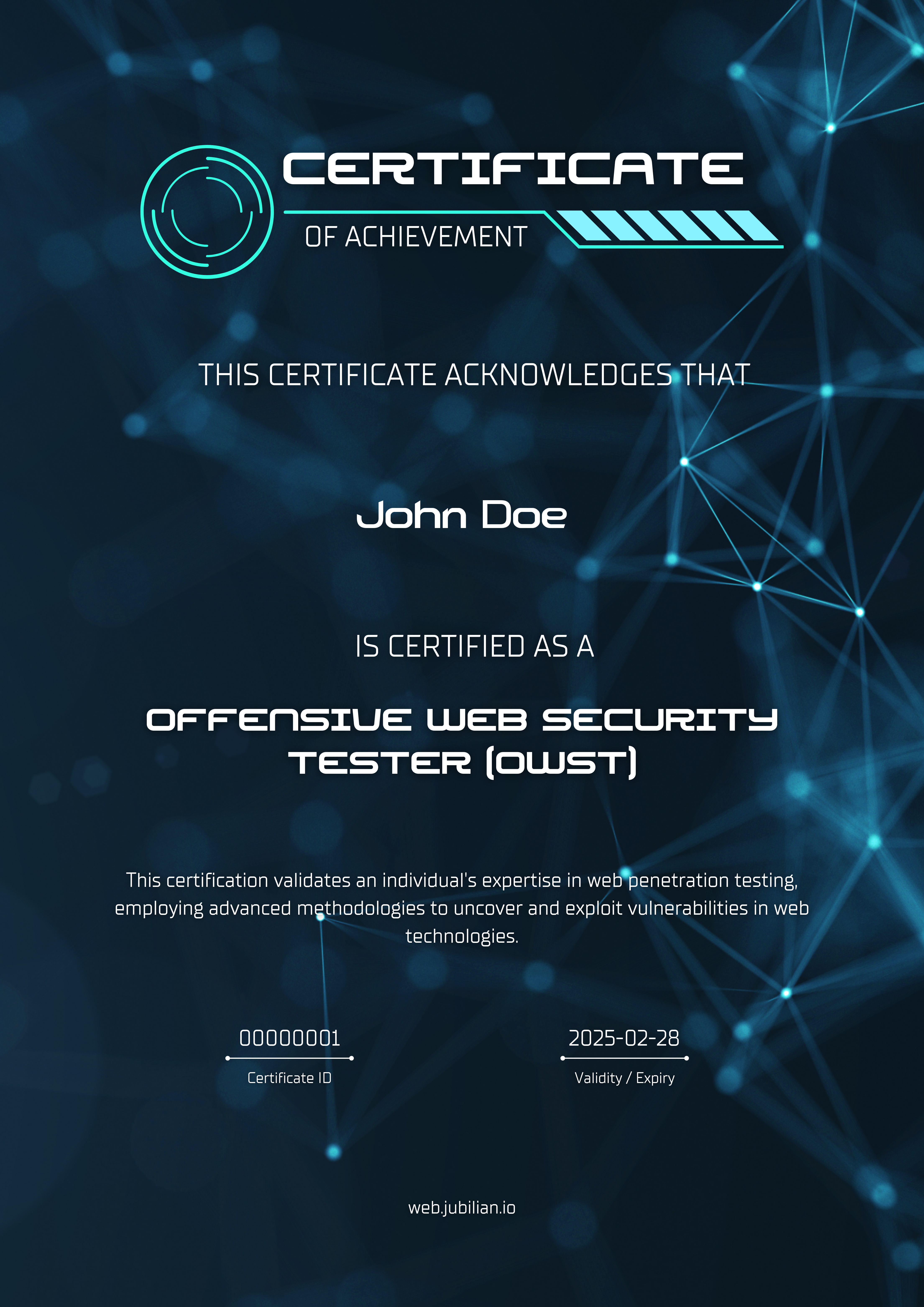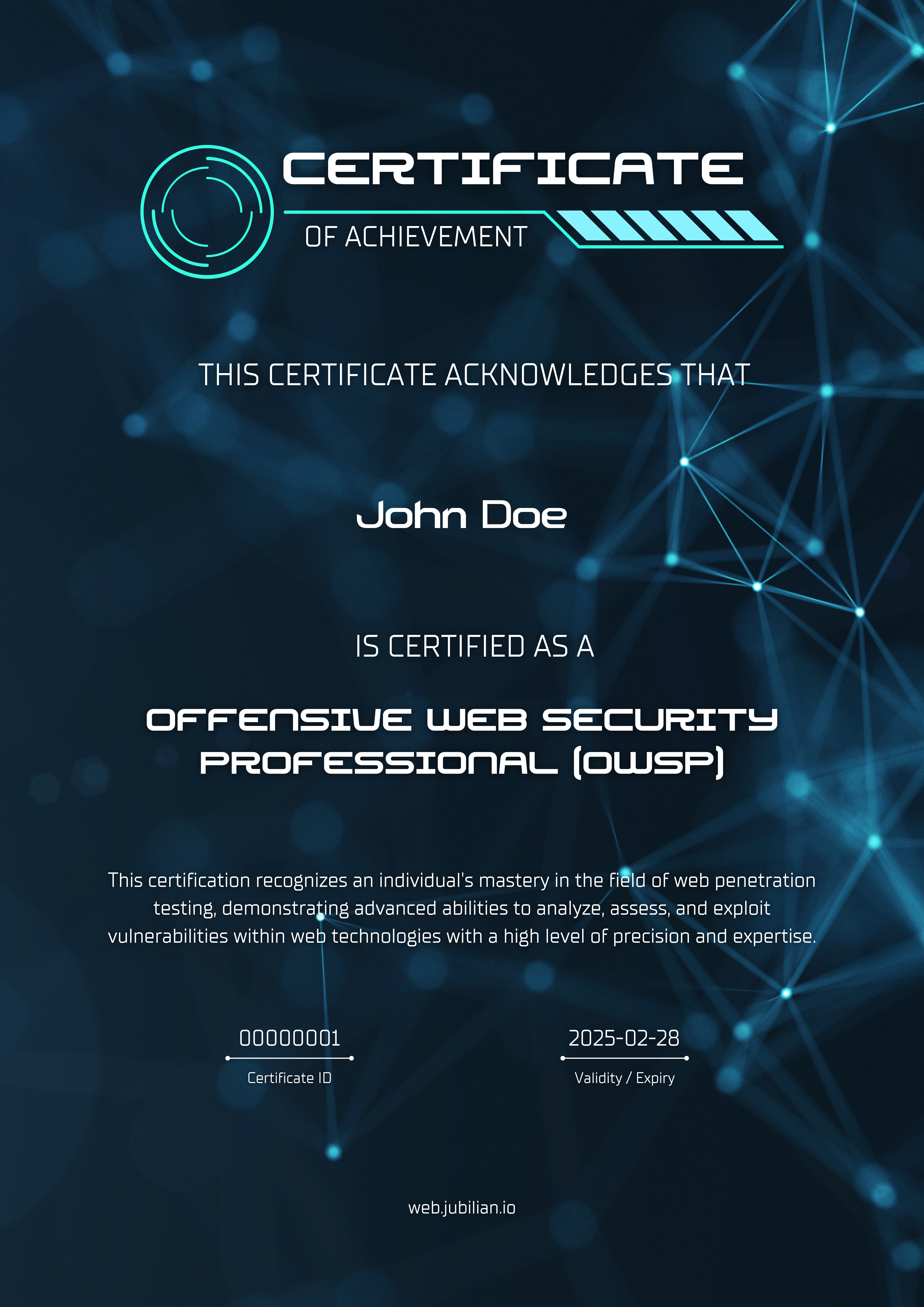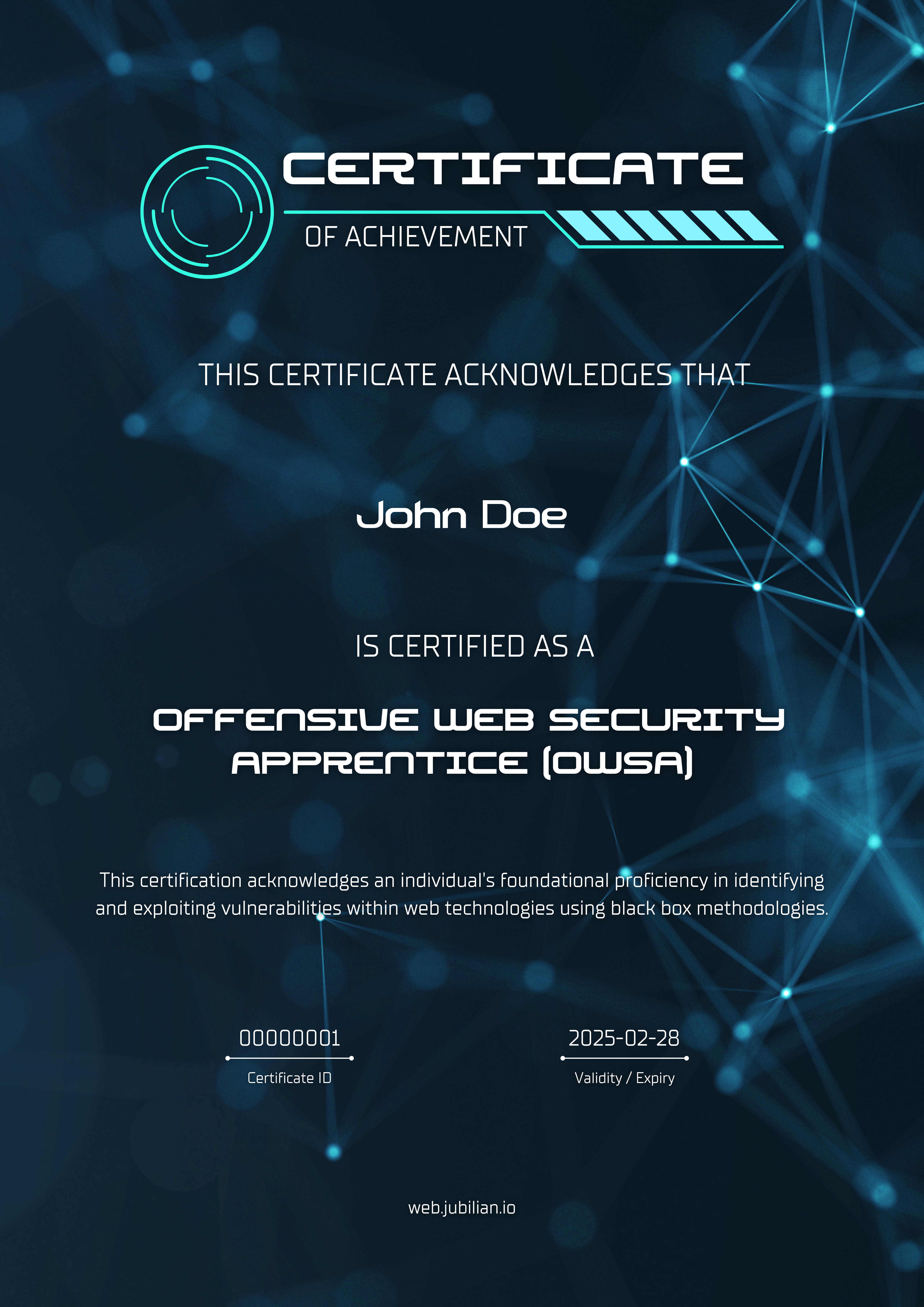Offensive Web Security Apprentice (OWSA): Certification is awarded upon successful completion of an easy-level challenge and subsequent recording of this achievement on the leaderboard. This certification remains valid for one year. To view a sample of this certification, click here.